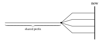 There is a useful special case for this rule. The mathematical analysis of the Ouroboros protocol10 tells us that when all participants in the network are following the protocol, their chains might be a little different near the tip (because not all forks are resolved yet), but the intersection point between all those chains will be no more than k blocks back. Moreover, blocks for “future” slots (slots that we haven’t reached yet11) are considered invalid. In other words, the situation looks a bit like this: