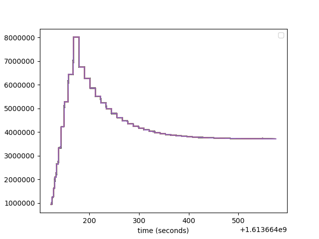 VmRSS in kB against wall clock time for a program that allocates a lot of data on startup then becomes mostly idle, run with -Fd0 (left) and -Fd4 (right).
