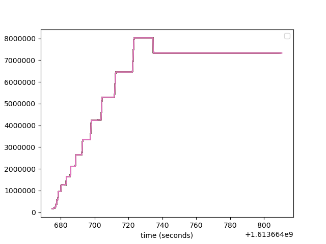 VmRSS in kB against wall clock time for a program that allocates a lot of data on startup then becomes mostly idle, run with -Fd0 (left) and -Fd4 (right).