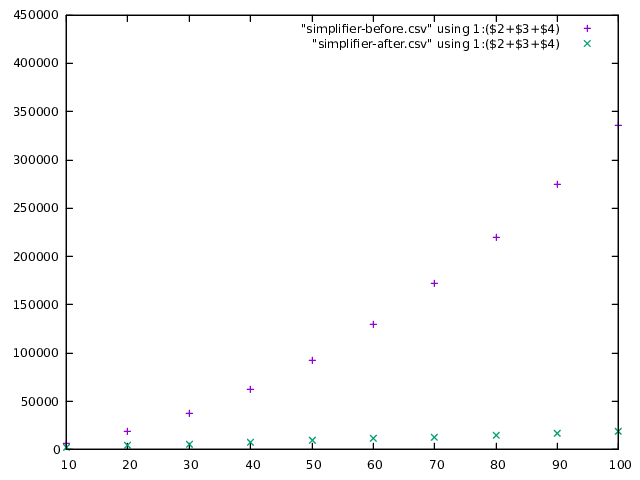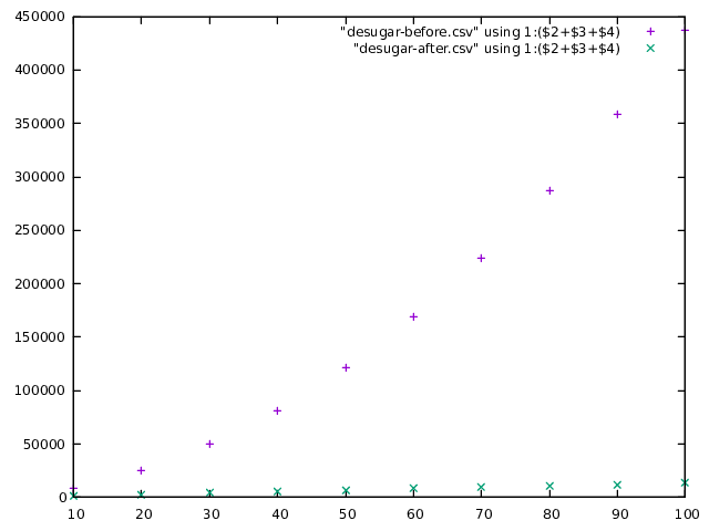 As you can see, for vanilla ghc the size grows quadratically to nearly 450,000