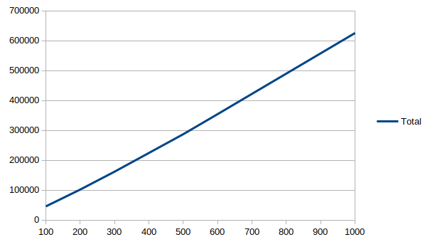 In terms of compile time performance, however, the results are pretty clear. Here is a graph of the size of the core AST of the module (the sum of the terms, types and coercions in the module) plotted against the number of record fields, after desugaring: