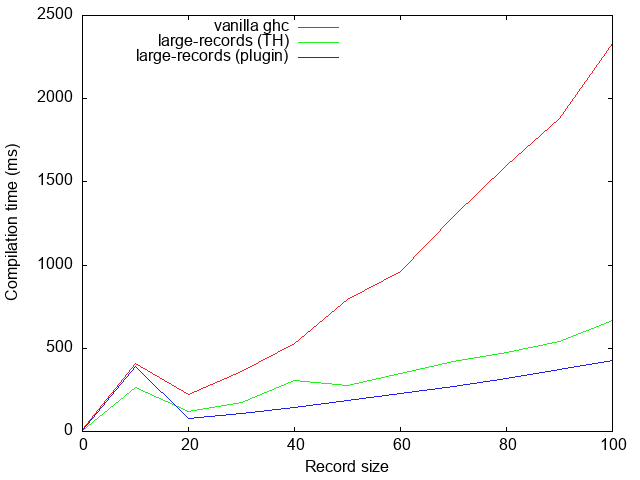 The code generated by the new source plugin is very similar to the code that was previously generated by TH. Critically, it is still linear in the size of the record (unlike standard ghc, which is quadratic); see to the full report on the (compile time) performance of large-records for details. We therefore don’t expect any super-linear improvements in compilation time; indeed, improvement of compilation time was not the point of this refactoring (other than avoiding unnecessary recompilations due to TH). It is nonetheless nice to see that the plugin is roughly 25% faster than TH: