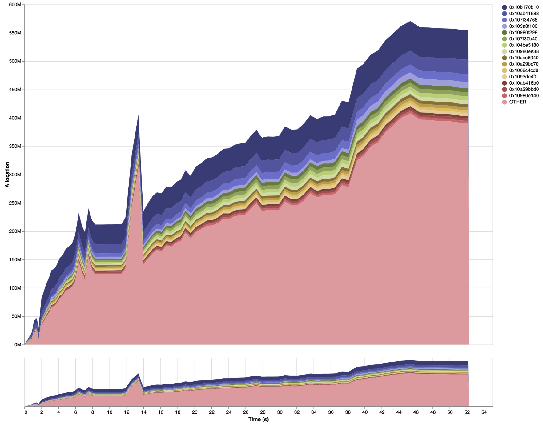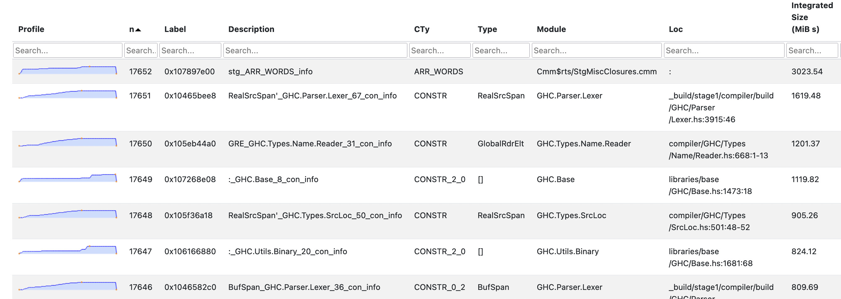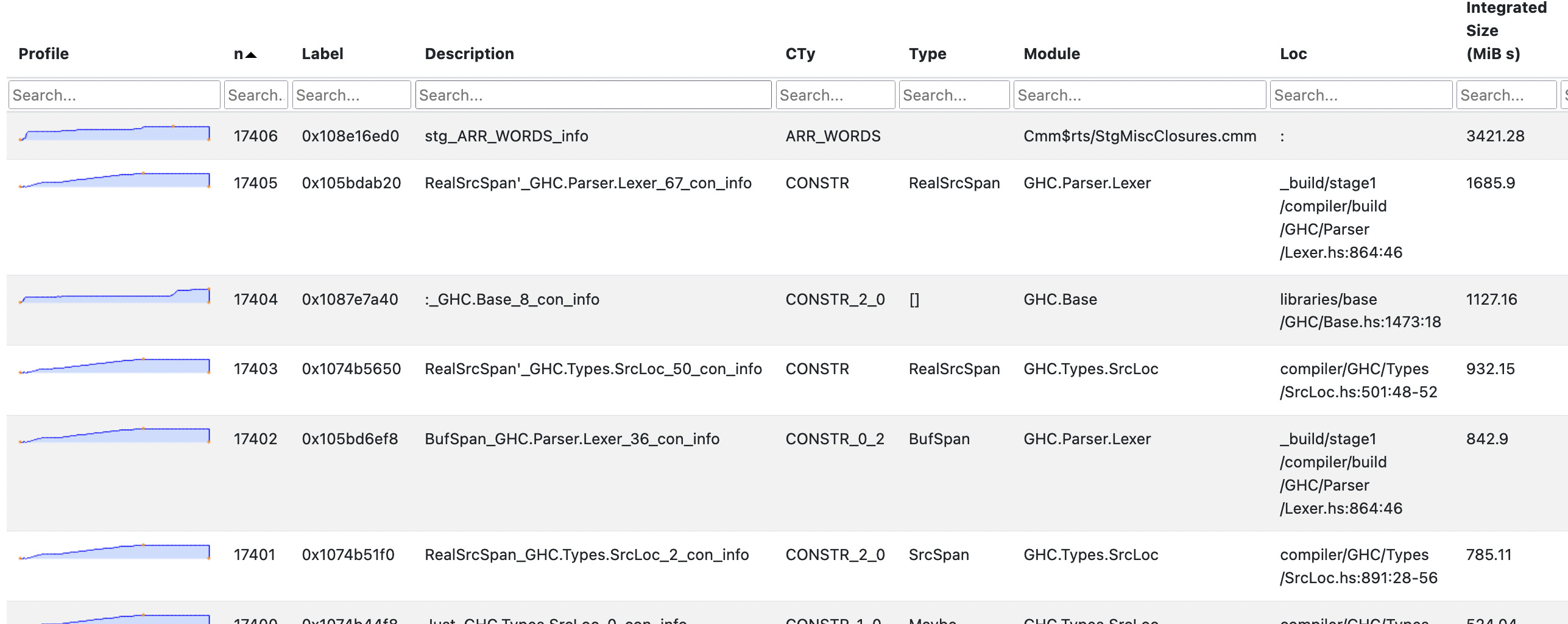 An info table roughly corresponds to an allocation site (such as a thunk or data constructor application) in the source code. For each info table, we see a sparkline profile of the heap usage over time, plus type information and a source location showing the code responsible for the allocation. This allows us to explore the sources of excessive allocations in more detail.