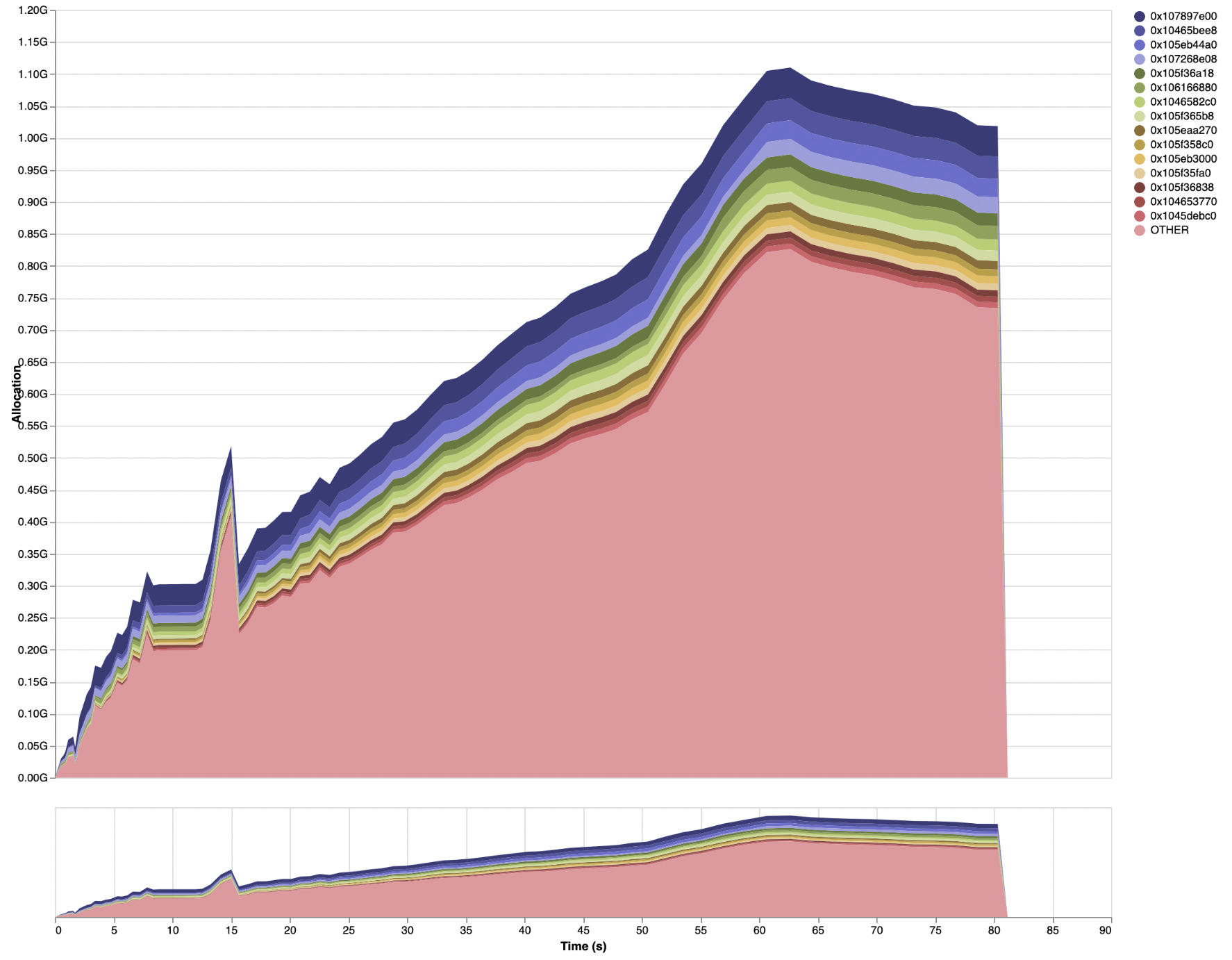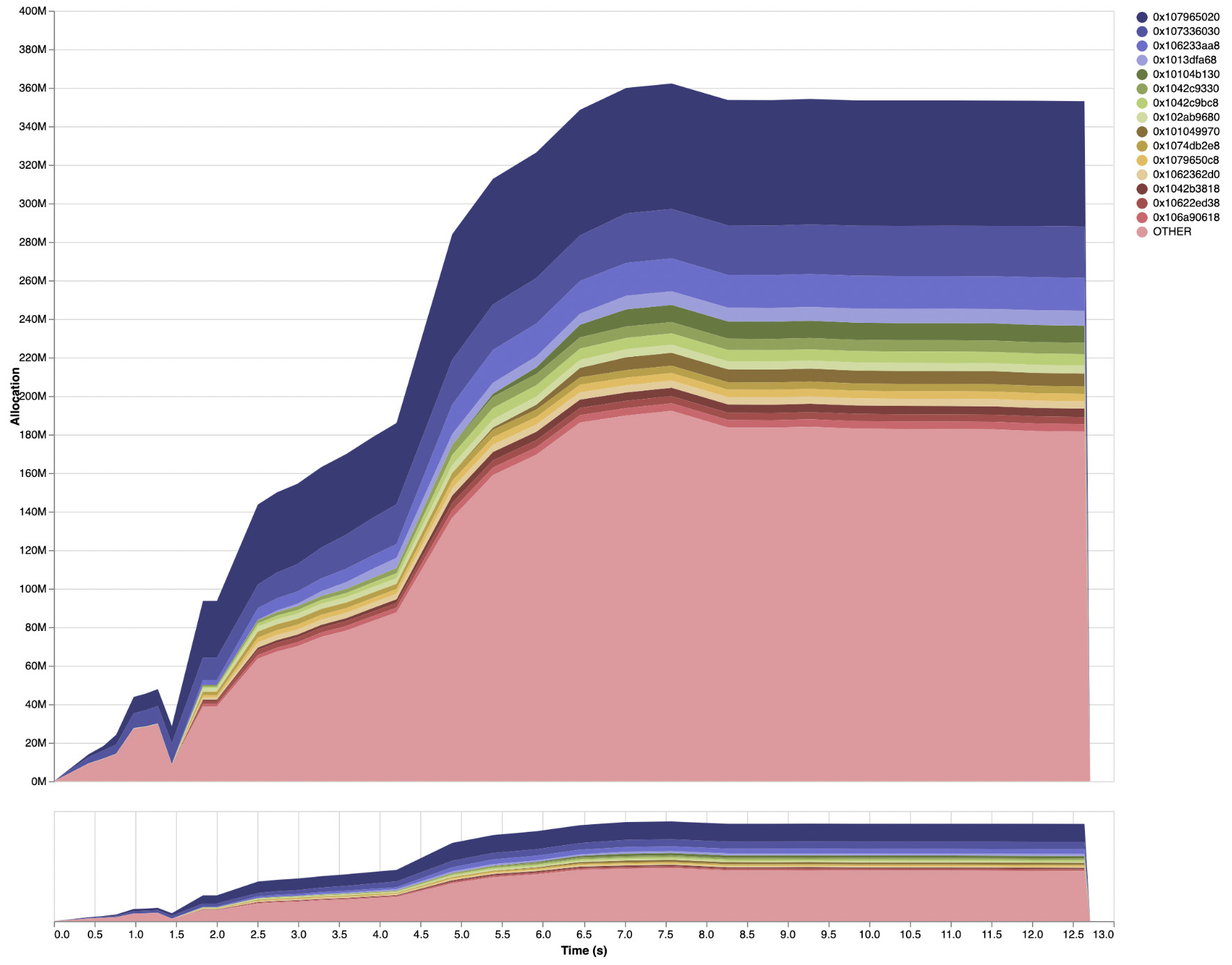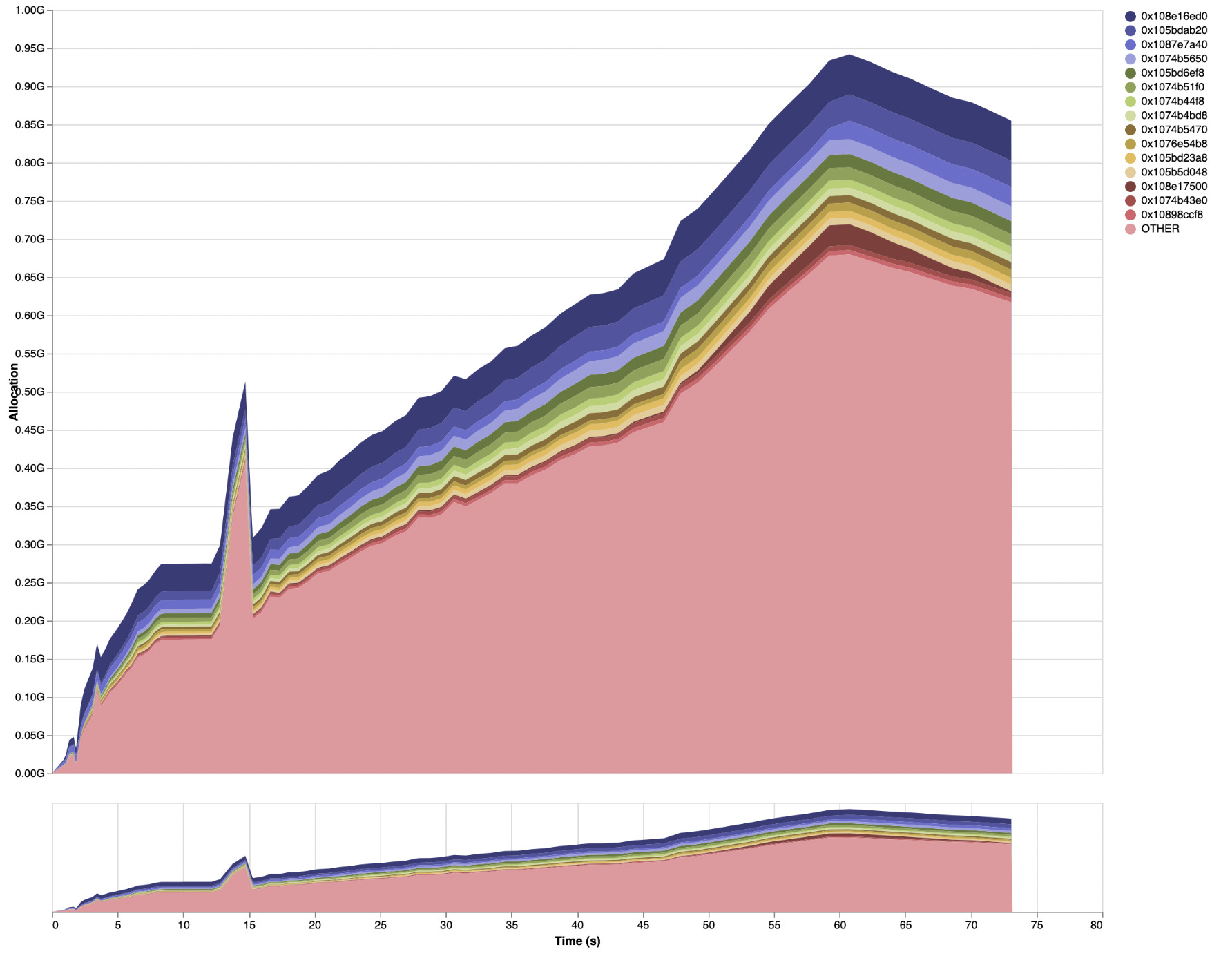 An info table roughly corresponds to an allocation site (such as a thunk or data constructor application) in the source code. For each info table, we see a sparkline profile of the heap usage over time, plus type information and a source location showing the code responsible for the allocation. This allows us to explore the sources of excessive allocations in more detail.