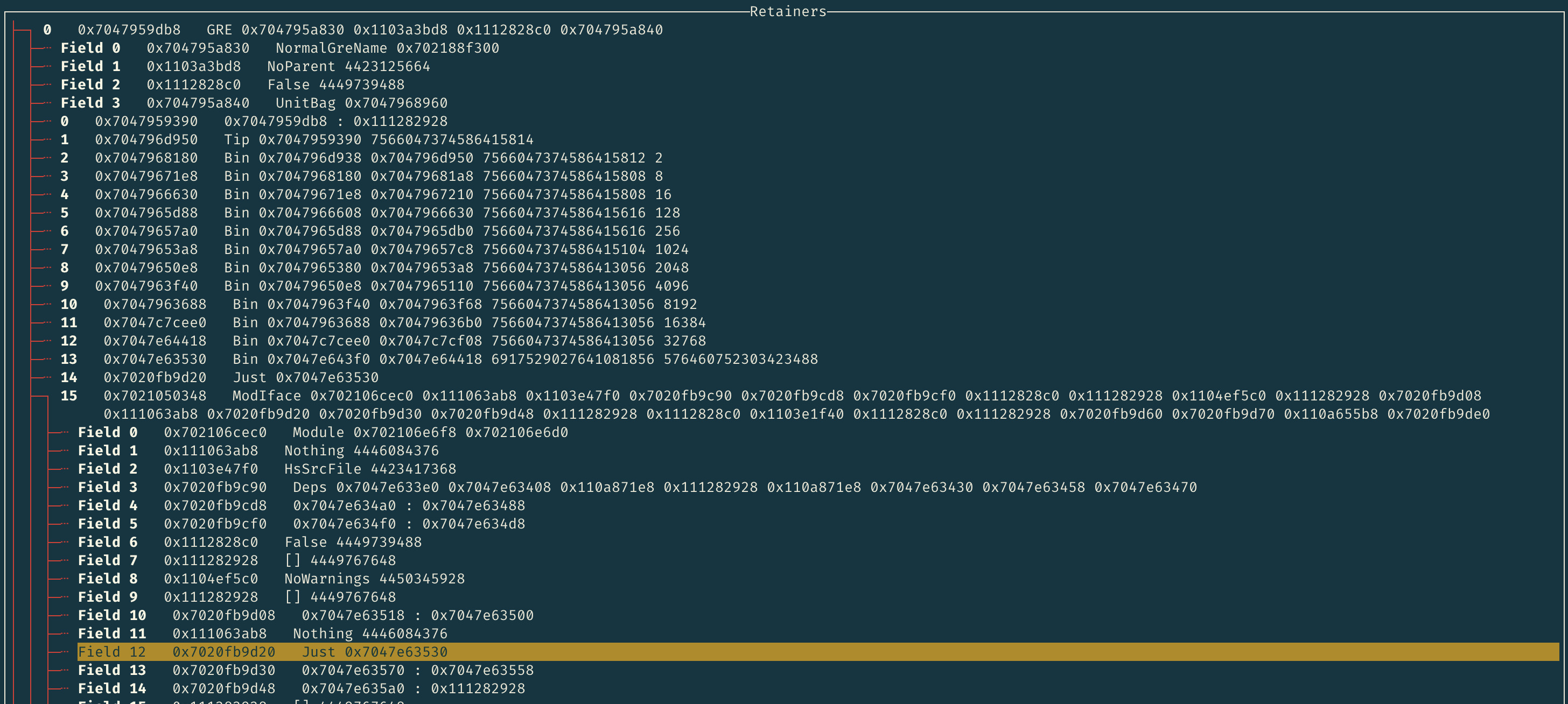 In this case, we see from retainer number 15 that the GRE closure is transitively retained by a ModIface closure, which we have expanded to show its fields. By comparing closure addresses, we see that the reference is in field 12, namely the mi_globals field of the ModIface constructor.